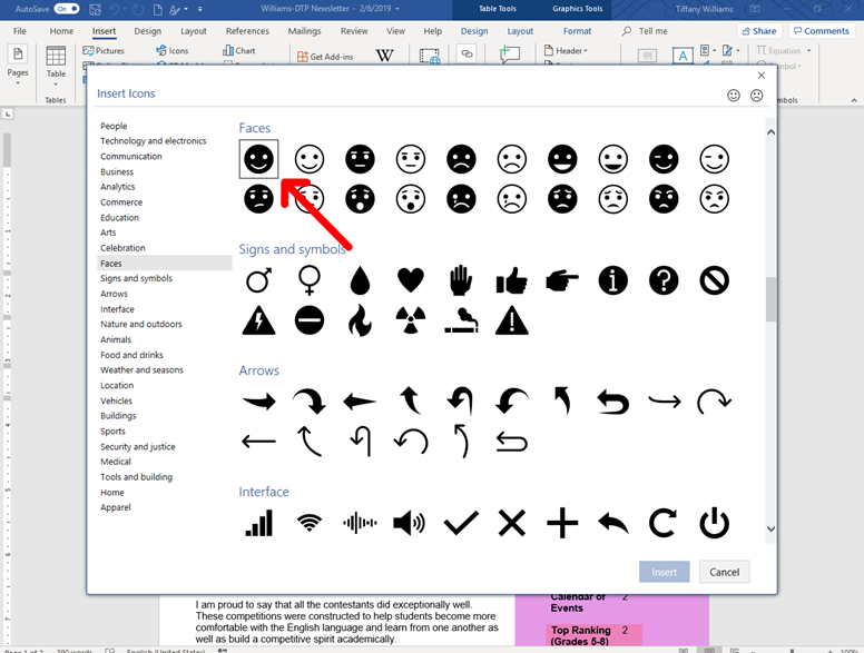 Go to the “insert” tab on the ribbon and select icons. A pop-up box with various icons will appear.