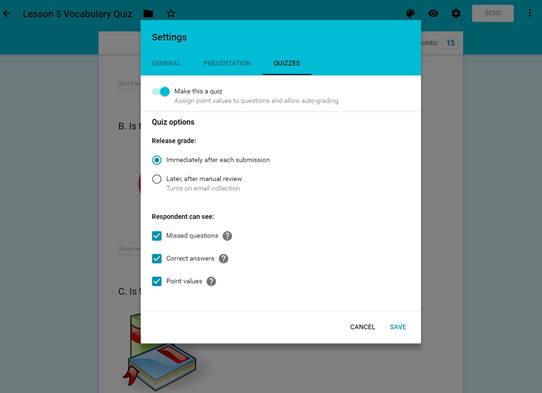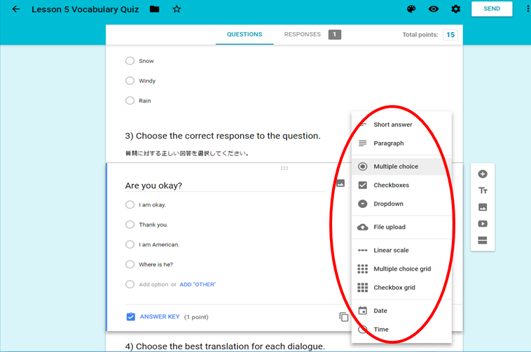 Google forms is an application by Google that allows the user to make surveys, but a person can do so much more with it than that. This week the class could decide between either making a survey or a quiz. I decided to use the form to make an ESL vocabulary quiz designed for students who speak Japanese as their native language. As you can see in the picture below, Google forms gives the user many different options for the structure of their survey.